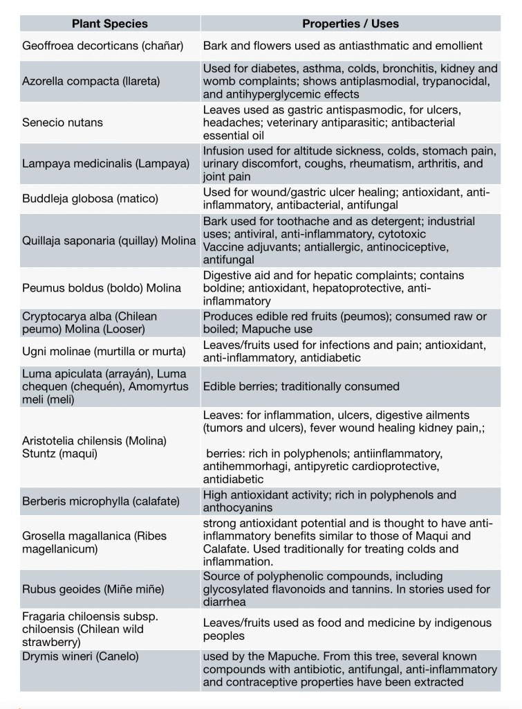 - Ruiz A, Hermosilla C, Romero ME, Walter T, Muñoz M, Devoto L, et al. Ethnopharmacology, phytochemistry and biological activities of native Chilean plants. Curr Pharm Des. 2021;27(9):1134–68. doi:10.2174/1381612826666201124105623.